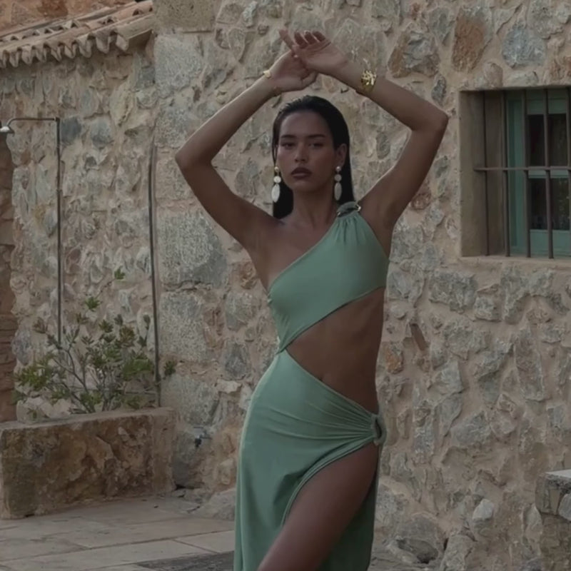Time to take power-dressing to new, elegant heights. This sleek, tailored gown from Sakuranna is as empowering as it is chic. Scarlett dress is designed in a one-shoulder style, with an alluring center cutout detail and sharp thigh-high side slit. Shaped to hug the figure, the Scarlett maxi dress is a statement style. Fearlessly show some skin!